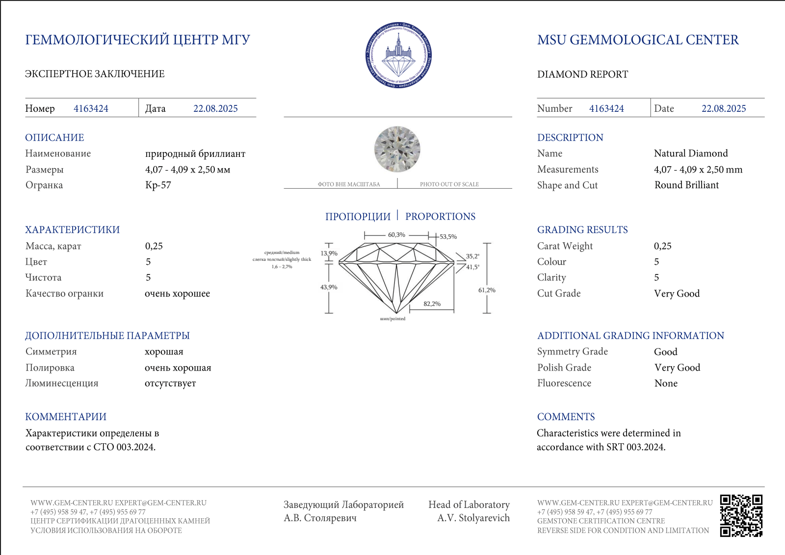 Природный бриллиант огранки "Кр-57" 0,25 ct. (5/5). Сертификат МГУ.