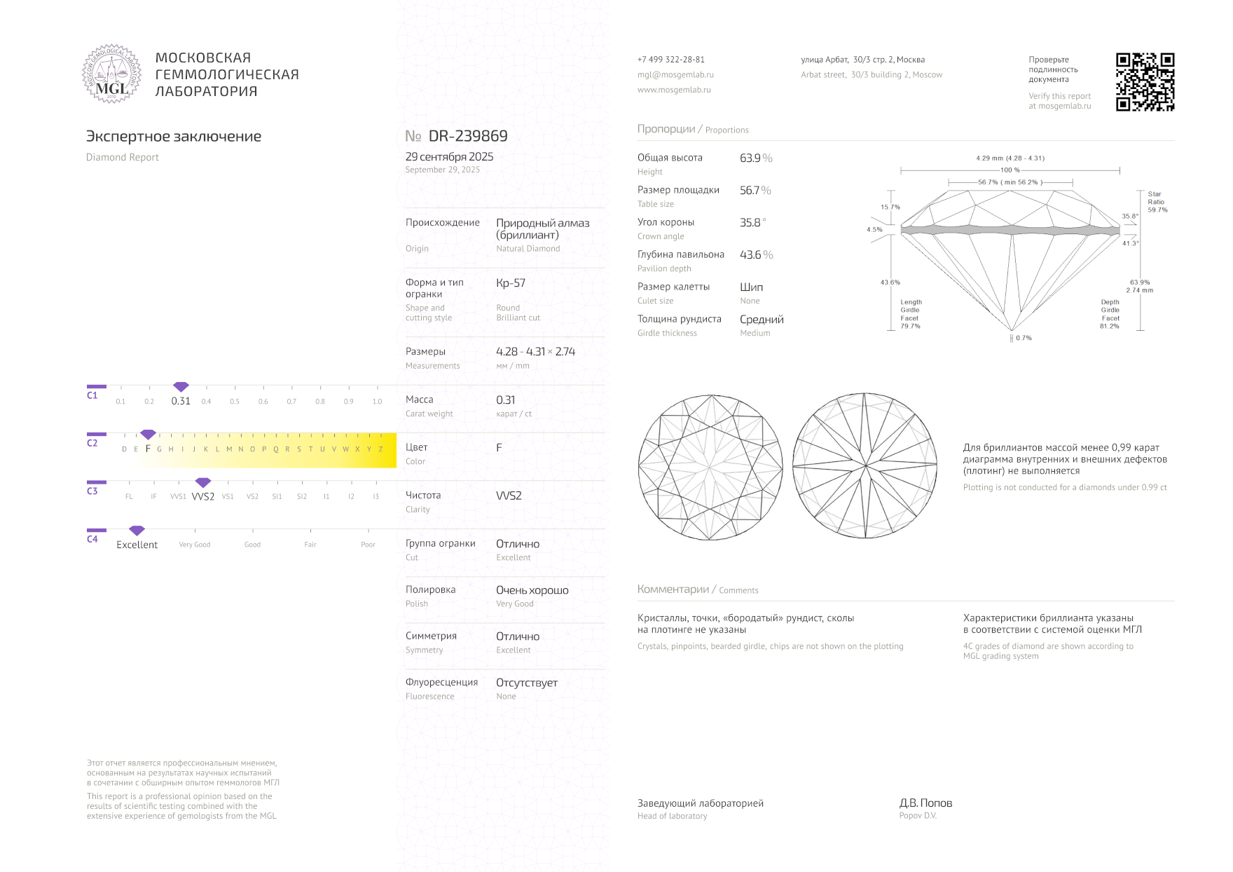 Природный бриллиант огранки "Кр-57" 0,31 ct. (F/VVS2). Сертификат МГЛ.