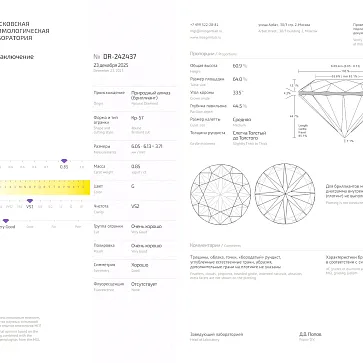 Природный бриллиант огранки "Кр-57" 0,31 ct. (G/SI2). Сертификат МГУ.