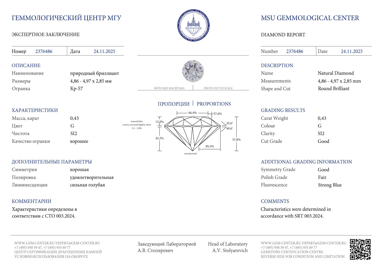 Природный бриллиант 1 шт. Кр-57 0,43 ct. (G/SI2). Сертификат МГУ.