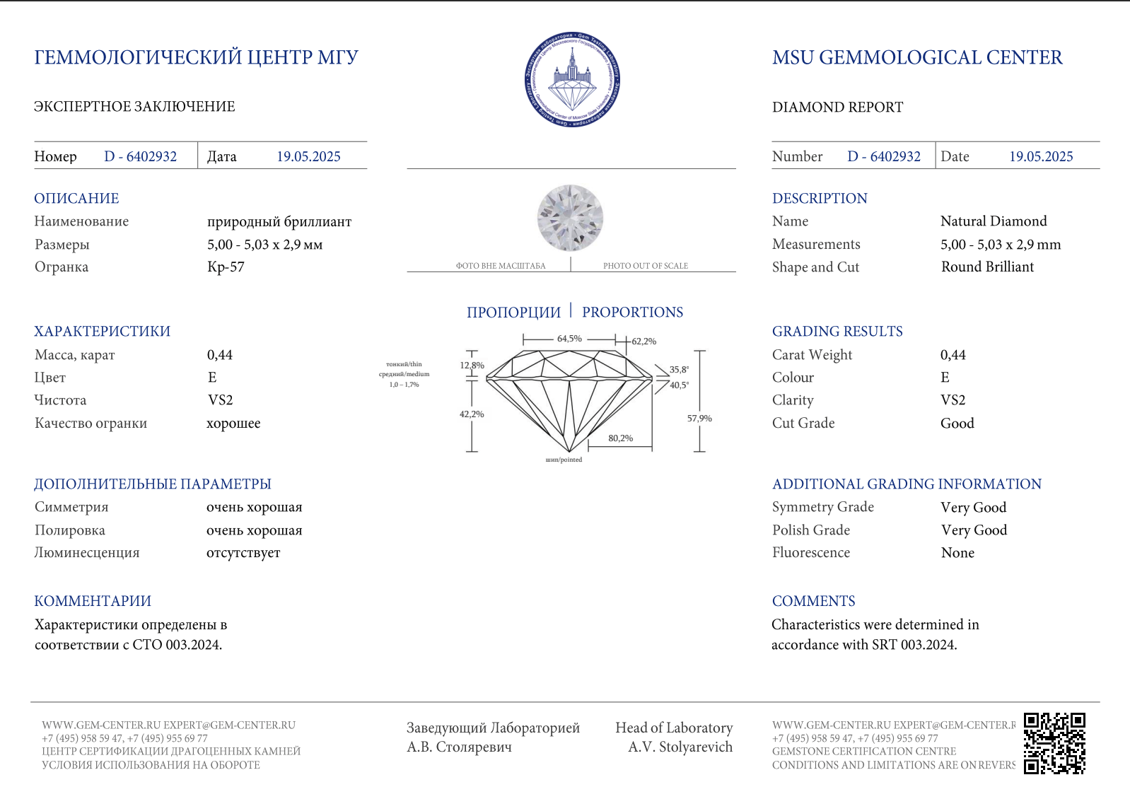 Природный бриллиант огранки «Кр-57» 0,44 ct. (E/VS2). Сертификат МГУ.