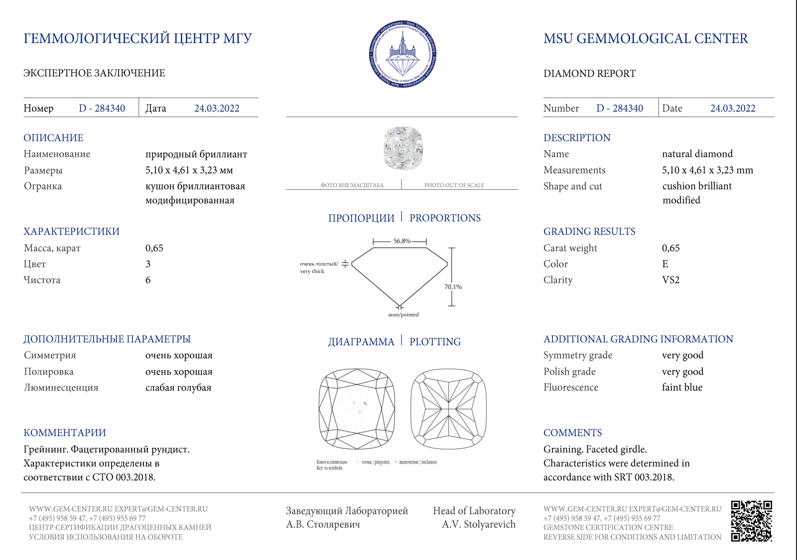 Природный бриллиант 1 шт. огранки "кушон" 0,65 ct. (E/VS2). Сертификат МГУ.