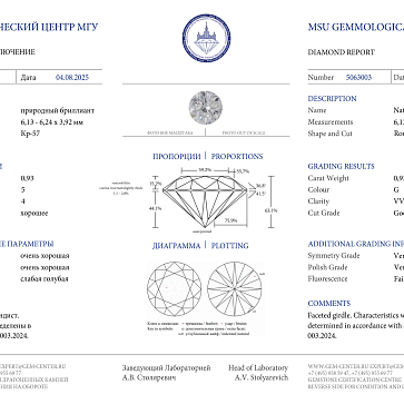 Природный бриллиант огранки "Кр-57" 0,85 ct. (G/VS2). Сертификат МГЛ.