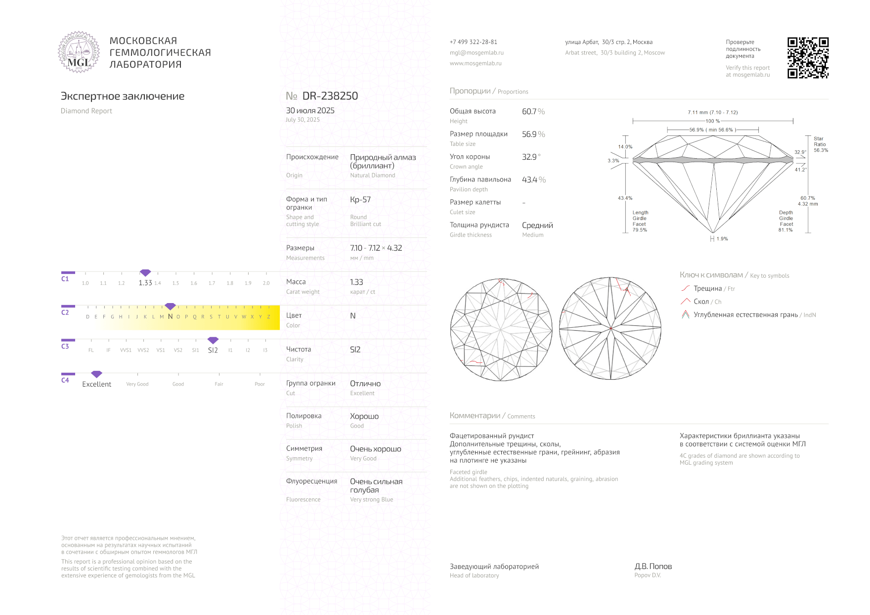 Природный бриллиант огранки "Кр-57" 1,33 ct. (N/SI2). Сертификат МГЛ.