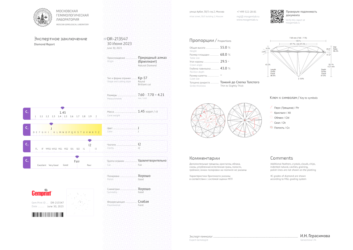 Природный бриллиант огранки "Кр-57" 1,45 ct. (J/I2). Сертификат МГЛ.