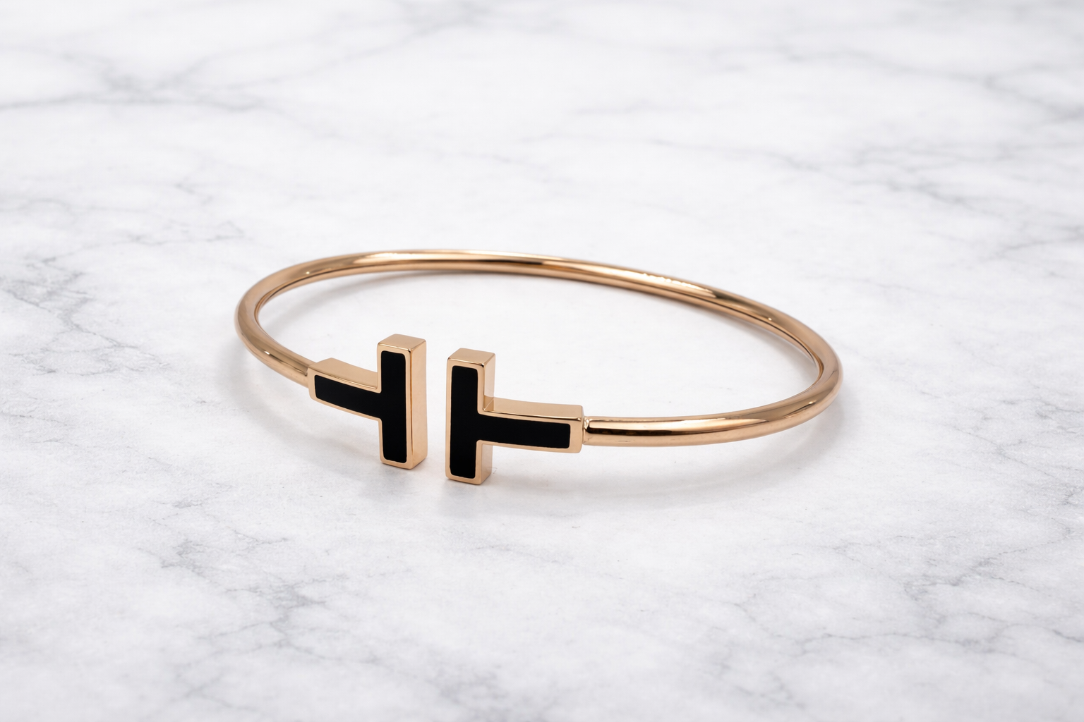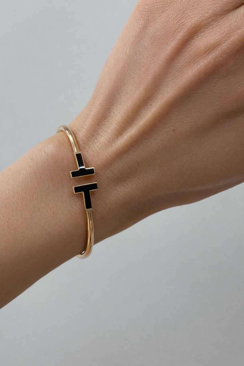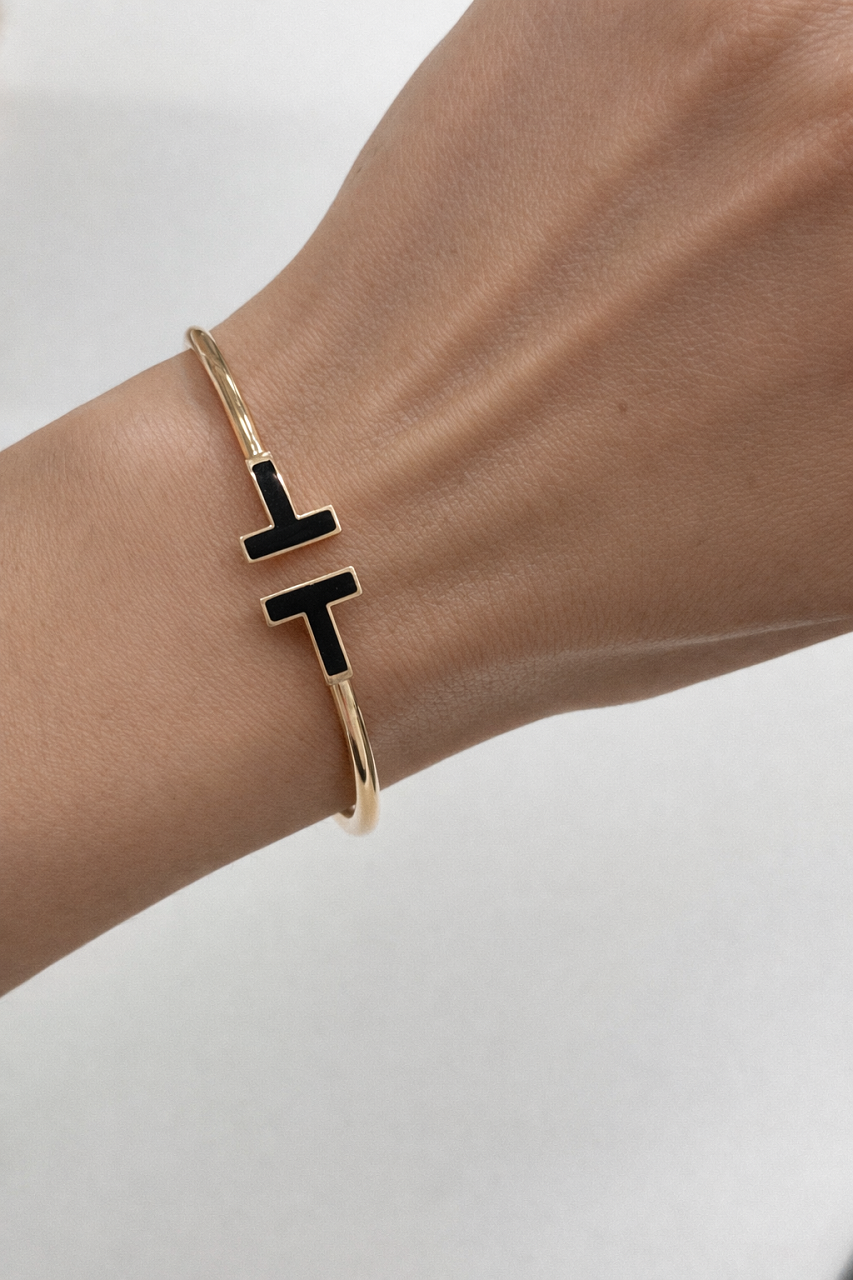 Браслет бренда Tiffany&Co. модель "T Wire", ref. 64028685, выполненный из розового золота 750 пробы с вставками чёрного оникса. Размер L.