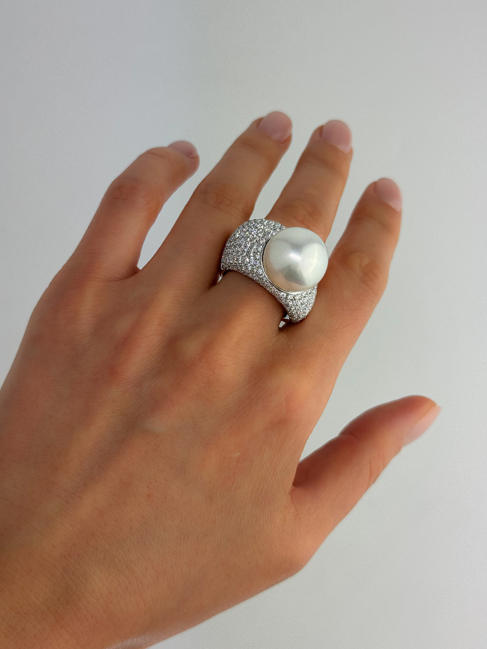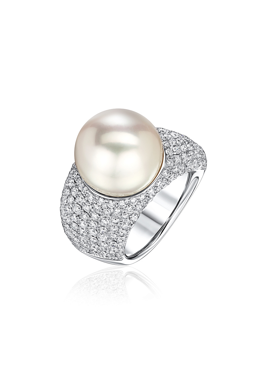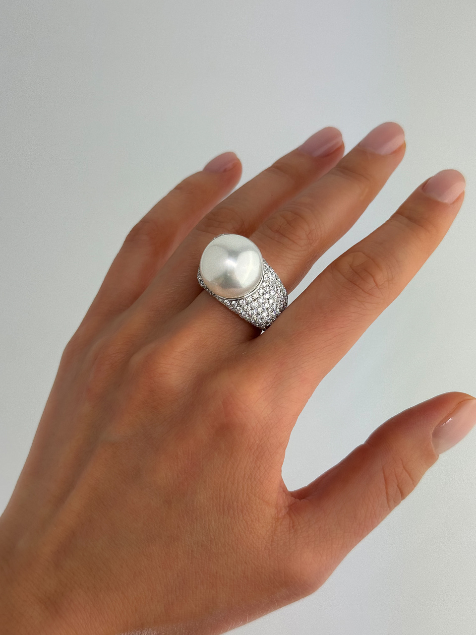 Кольцо Schoeffel коллекции Happy Day, выполненное из белого золота 750 пробы с бриллиантами классической формы огранки и одной жемчужиной Южных морей диаметром 15,20 мм. Размер кольца - 16,8. Вес - 21,97 гр.