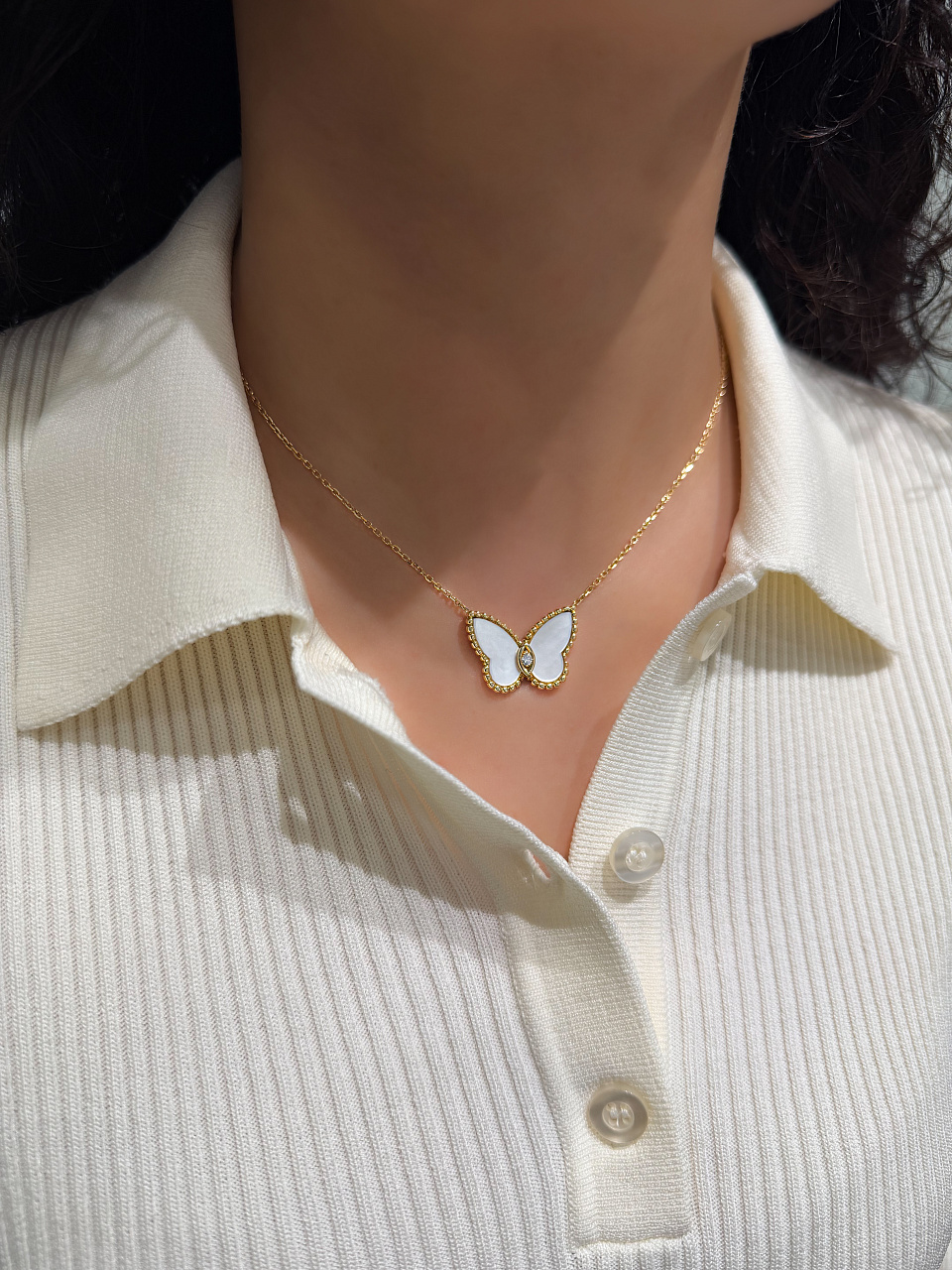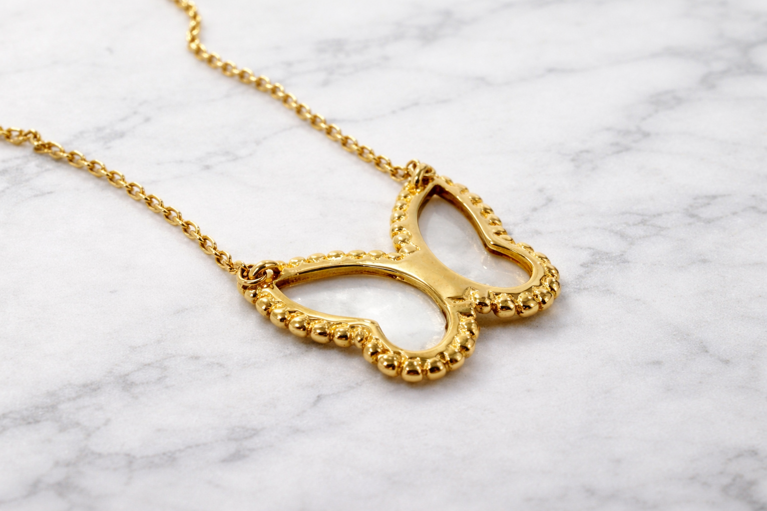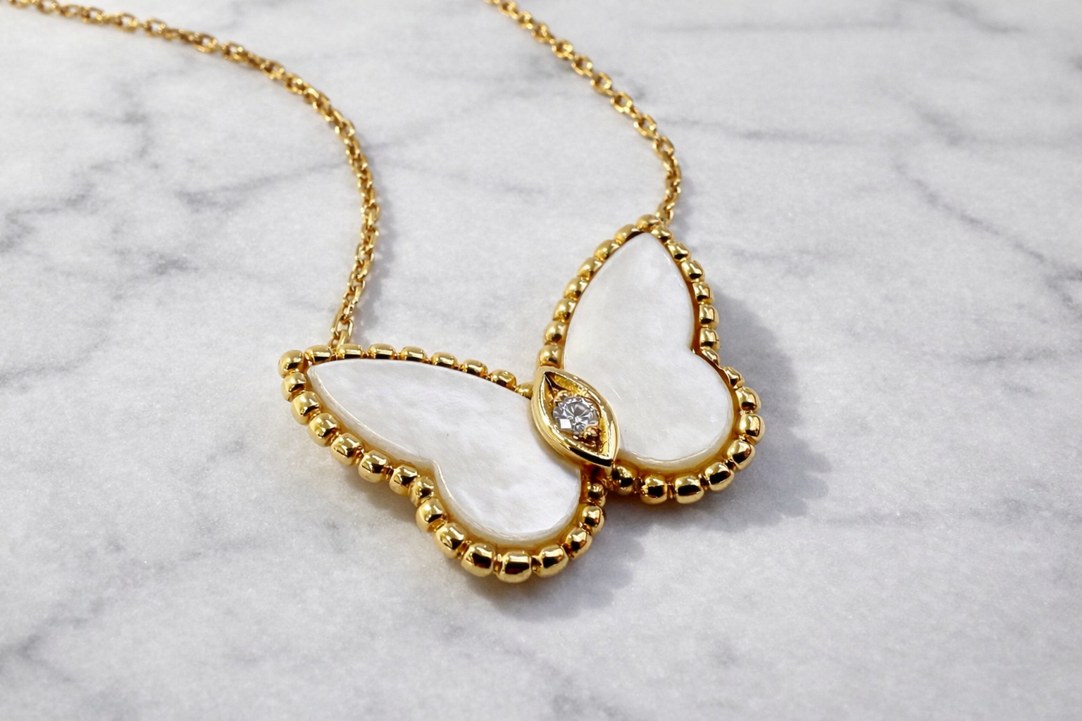 Подвеска Van Cleef & Arples модель Papillon (Бабочка) выполнена из золота 750 пробы с перламутровой вставкой (Mother-of-Pearl) и бриллиантом круглой огранки 0,06 карат. Винтажная модель 80х-90х годов.