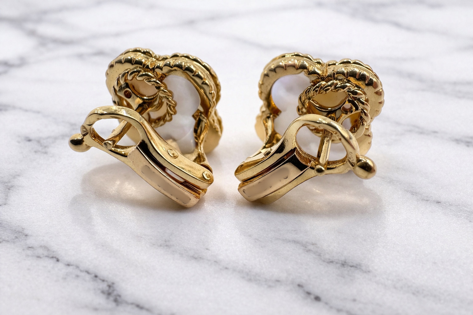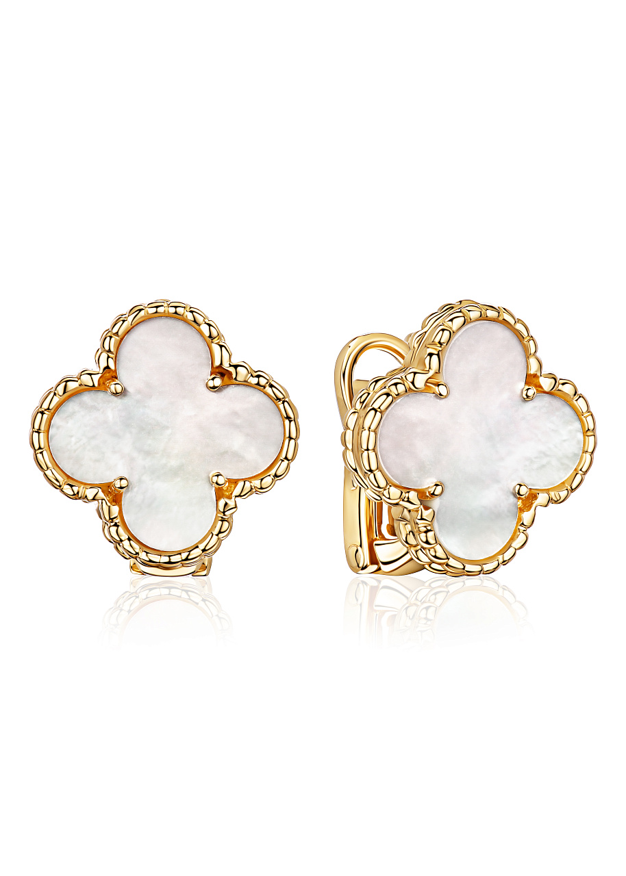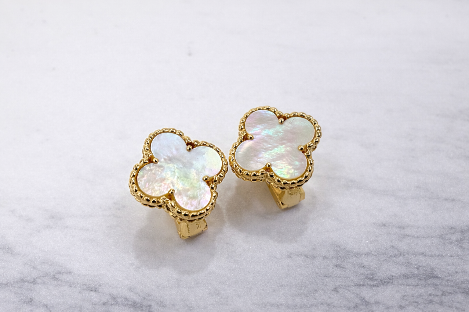 Серьги Van Cleef & Arples коллекции Vintage Alhambra выполнены из золота 750 пробы с перламутровыми вставками (Mother-of-Pearl). Длина серьги 15 мм. Винтажная модель 80х-90х годов.