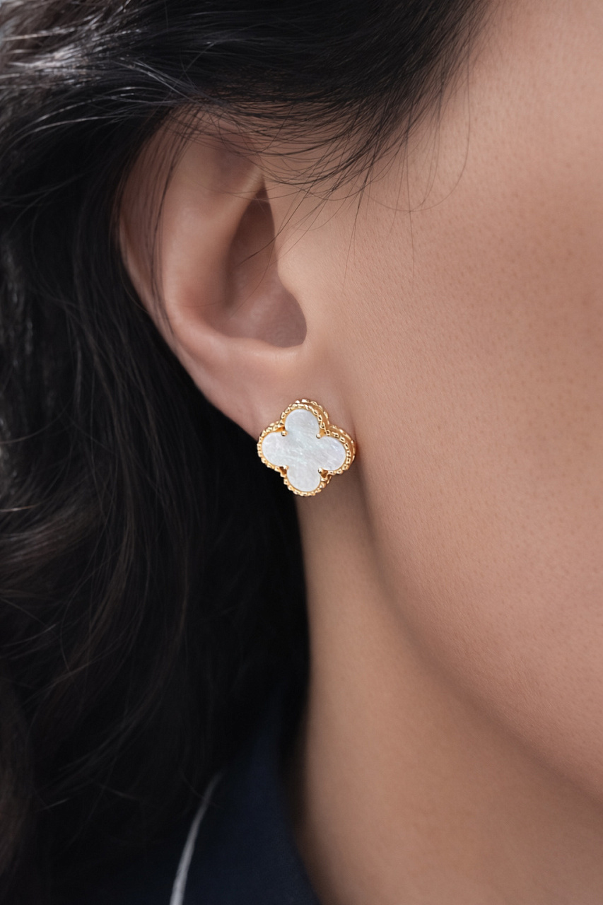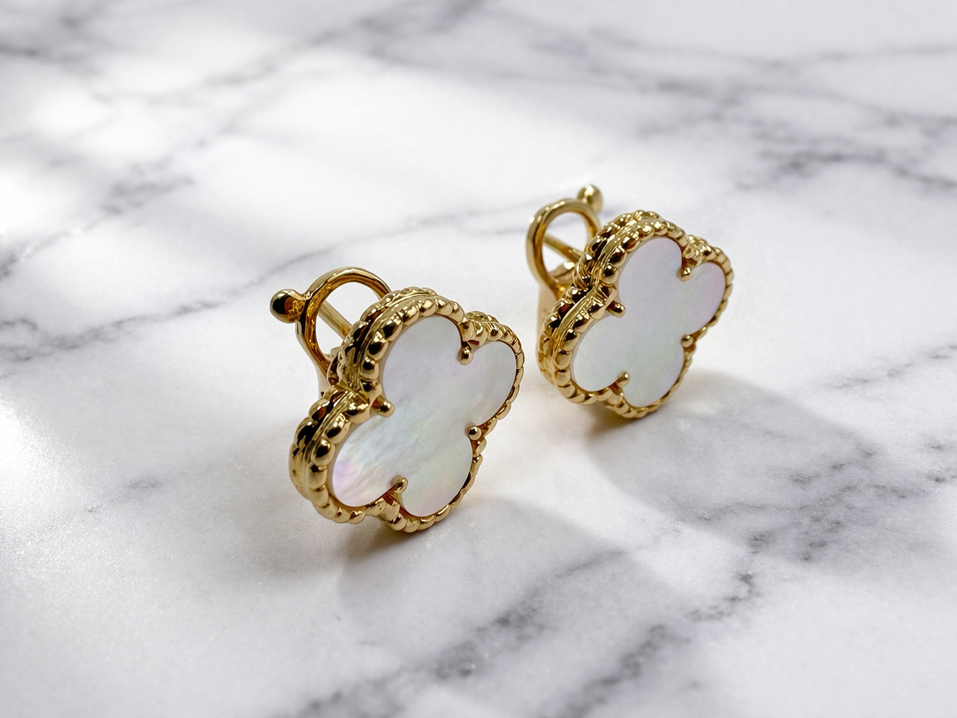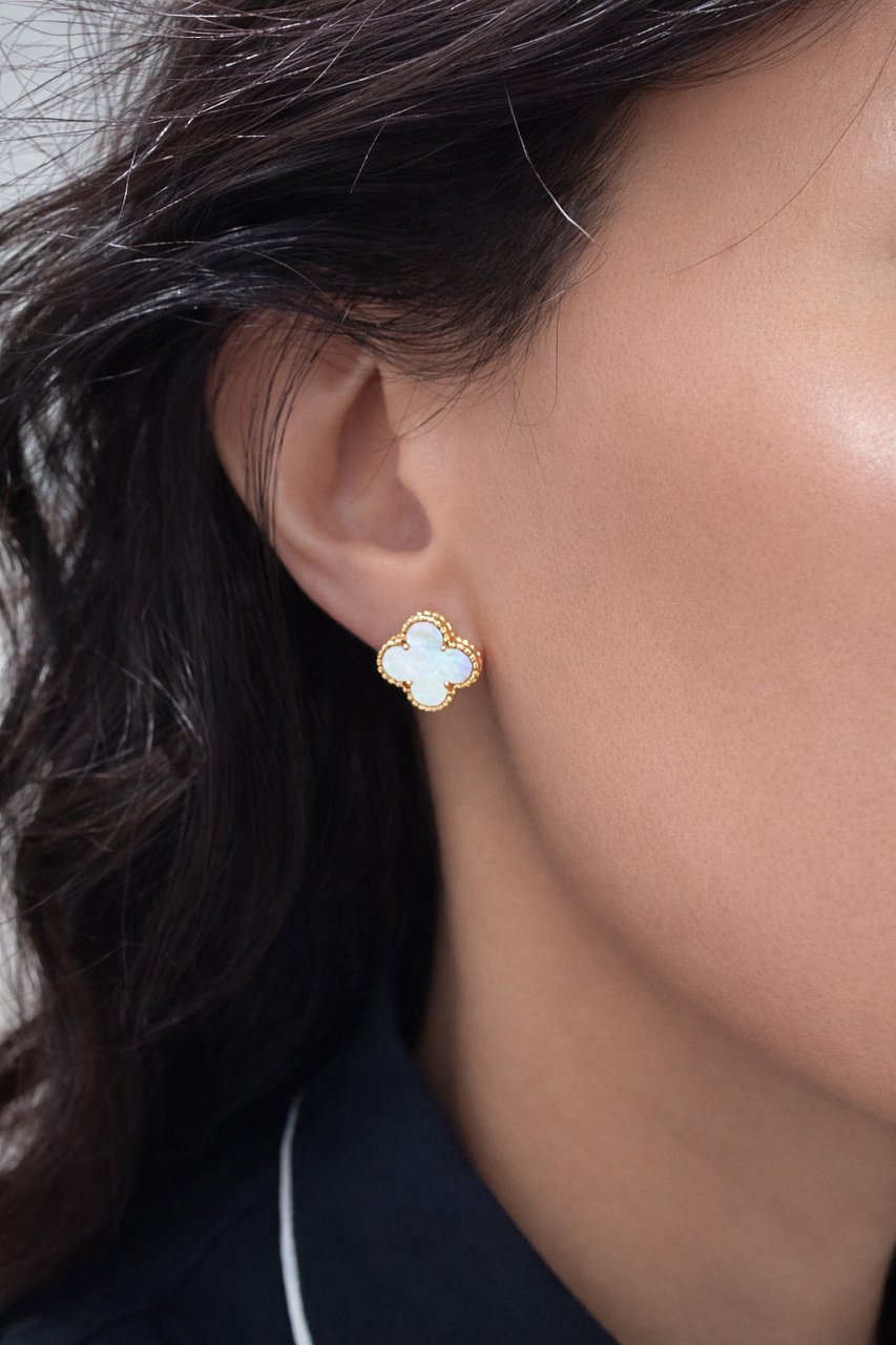 Серьги Van Cleef & Arples коллекции Vintage Alhambra выполнены из золота 750 пробы с перламутровыми вставками (Mother-of-Pearl). Длина серьги 15 мм. Винтажная модель 80х-90х годов.