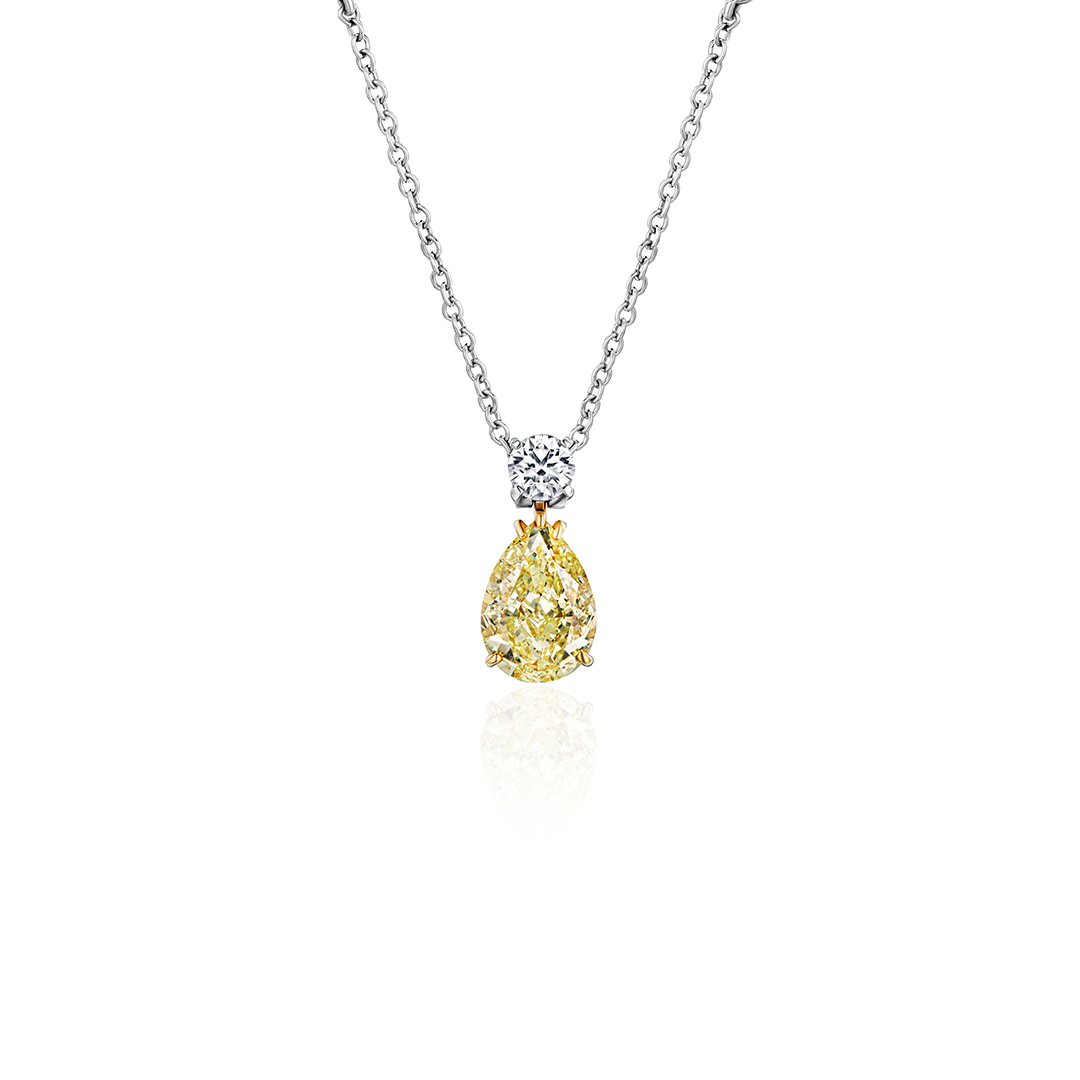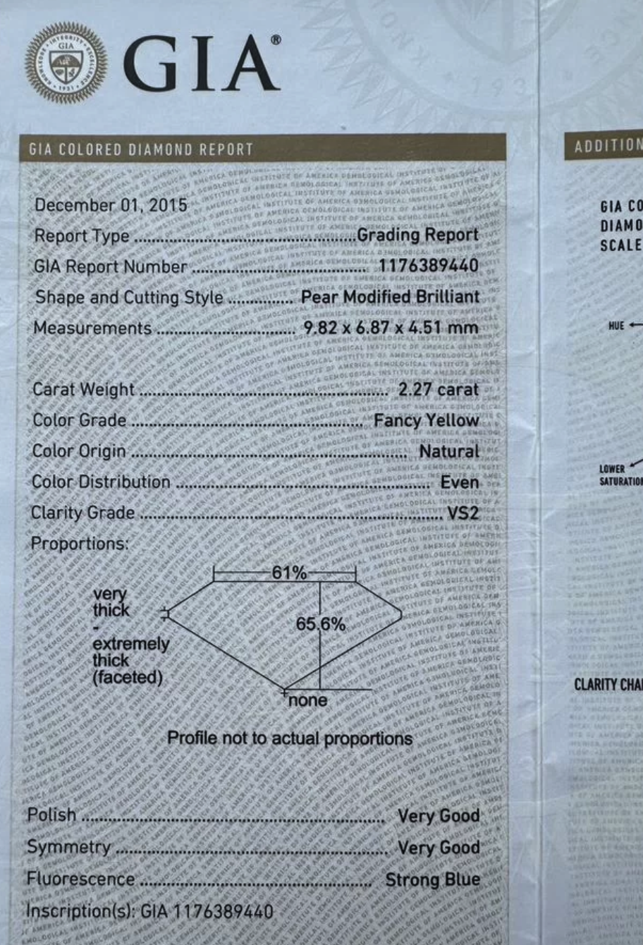 Бриллианты: - 1 шт. огранки "груша" 2,27 ct. (Fancy Yellow - VS2) - 7 шт. Кр-57 0,36 ct. (G-VS) - 1 шт. Кр-57 0,01 ct. (G-VS)