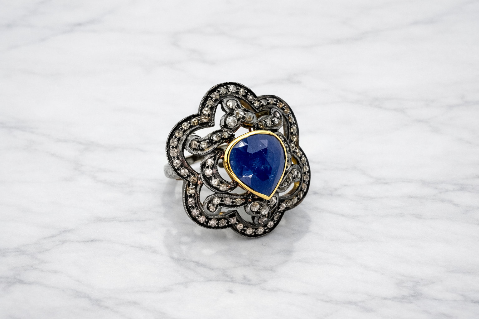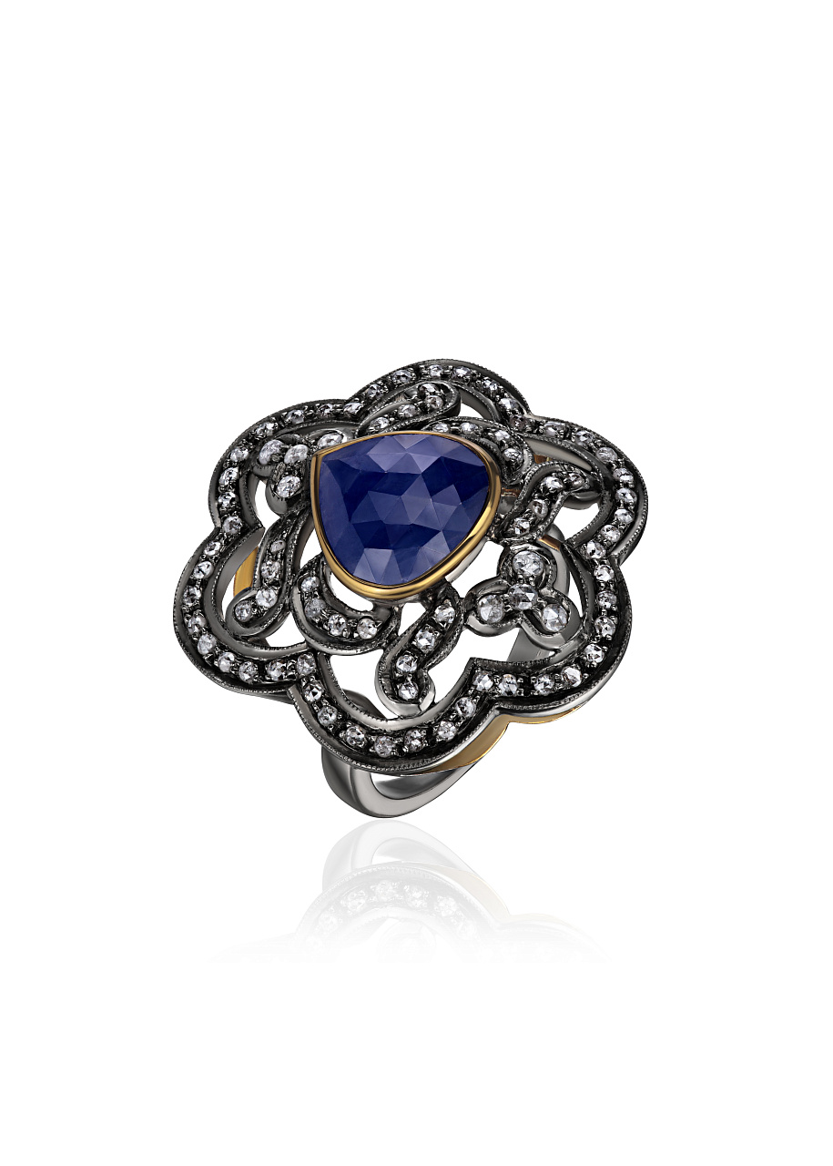 Бриллианты стариной огранки "Роза" 80 шт. 1.00 ct. (3-5/5-6), Сапфир 1.50 ct.