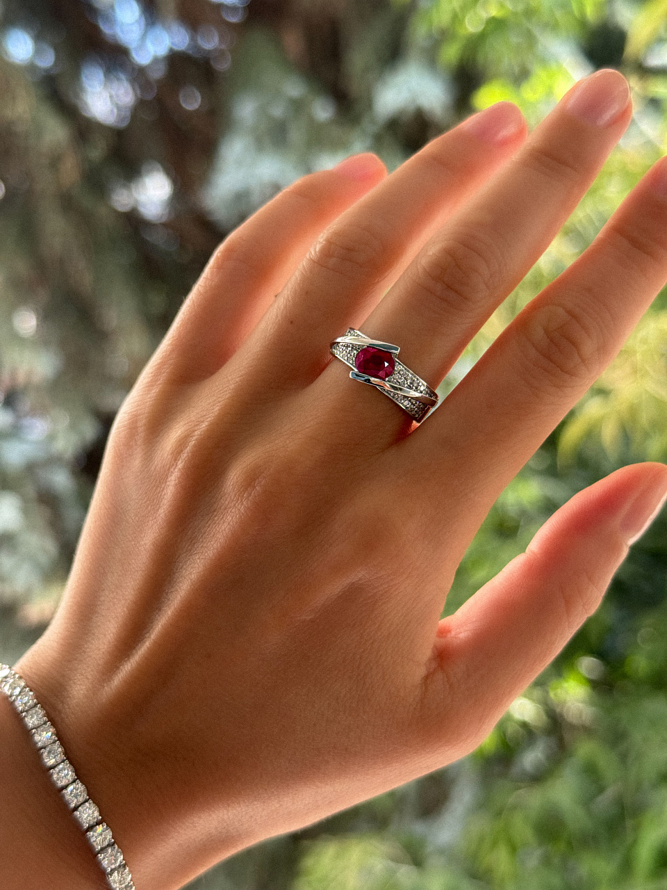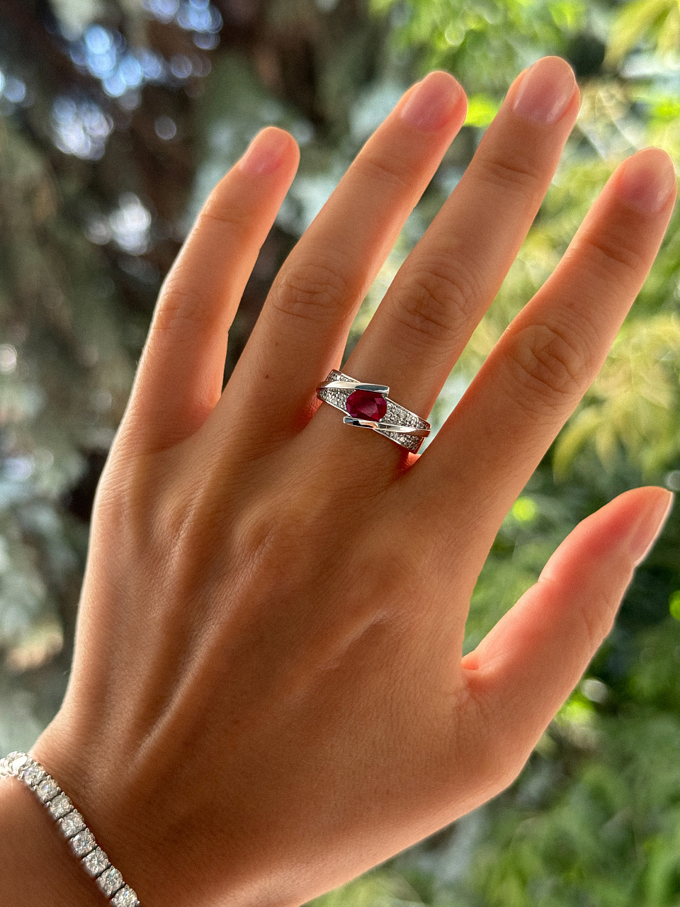 Рубин 1 шт. огранки"овал" 0,94 ct. (3б/4), Бриллианты 50 шт. Кр-57 0,47 ct. (3-4/6-7)