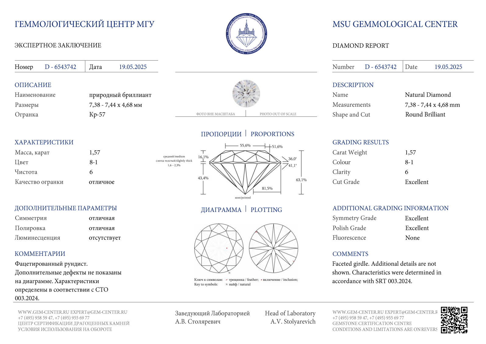 Бриллианты: - 1 шт. Кр-57 1,57 ct. (8-1/6) - 1 шт. Кр-57 1,53 ct. (8-2/8)