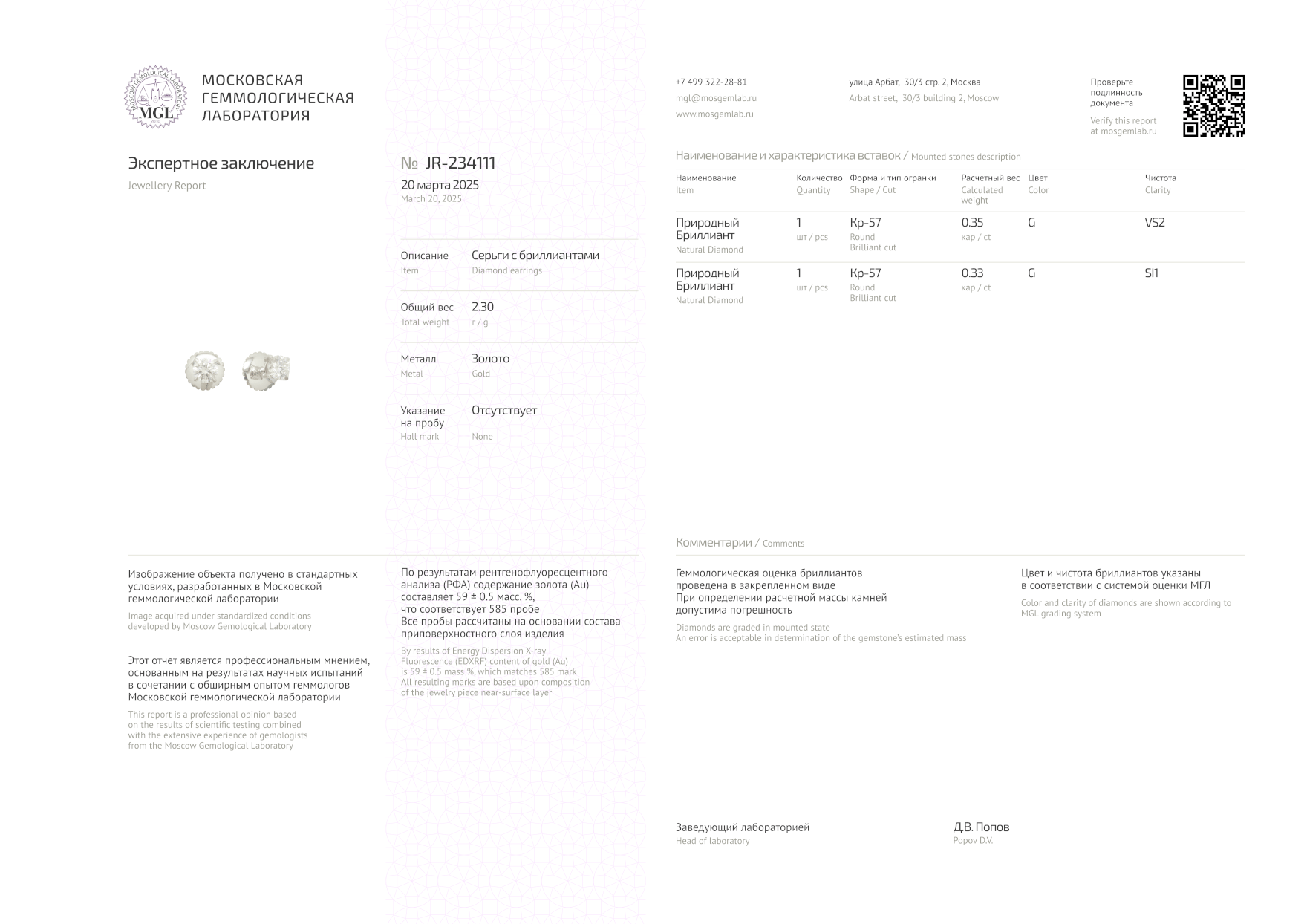 Бриллианты: - 1 шт. Кр-57 0,35 ct. (G/VS2) - 1 шт. Кр-57 0,33 ct. (G/SI1)