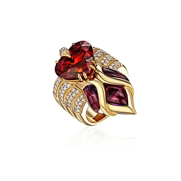 Золотое кольцо с природными бриллиантами, гранатом и аметистами