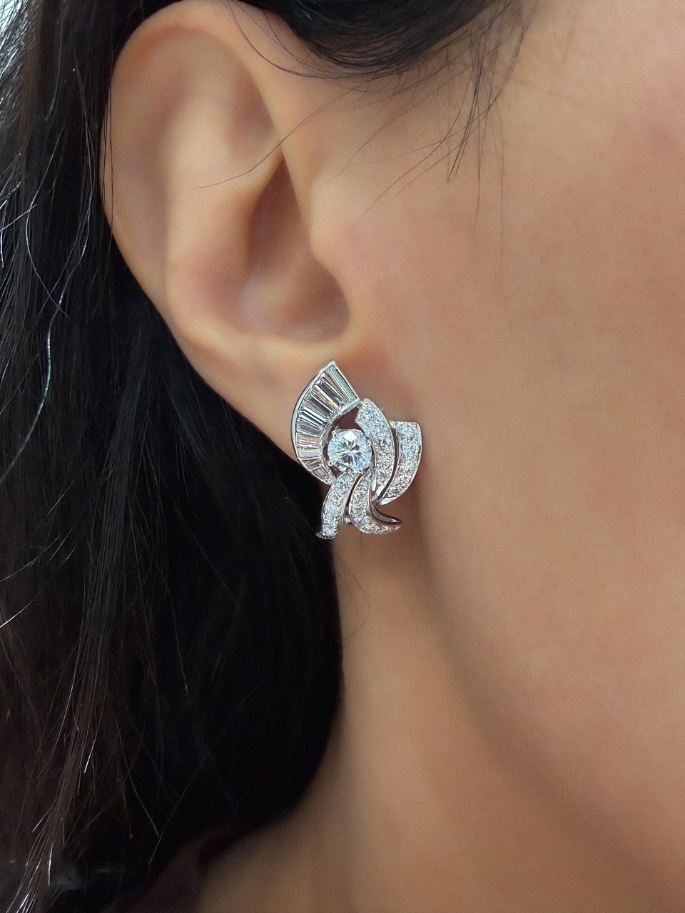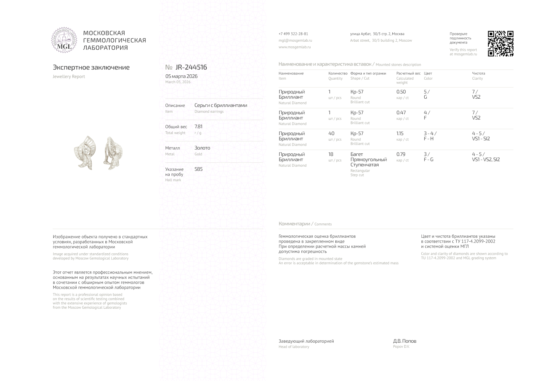 Бриллианты: - 1 шт. Кр-57 0,50 ct. (G/VS2) - 1 шт. Кр-57 0,47 ct. (F/VS2) - 40 шт. Кр-57 1,15 ct. (F-H/VS1-SI2) - 18 шт. огранки "багет" 0,79 ct. (F-G/VS1-VS2, SI2)