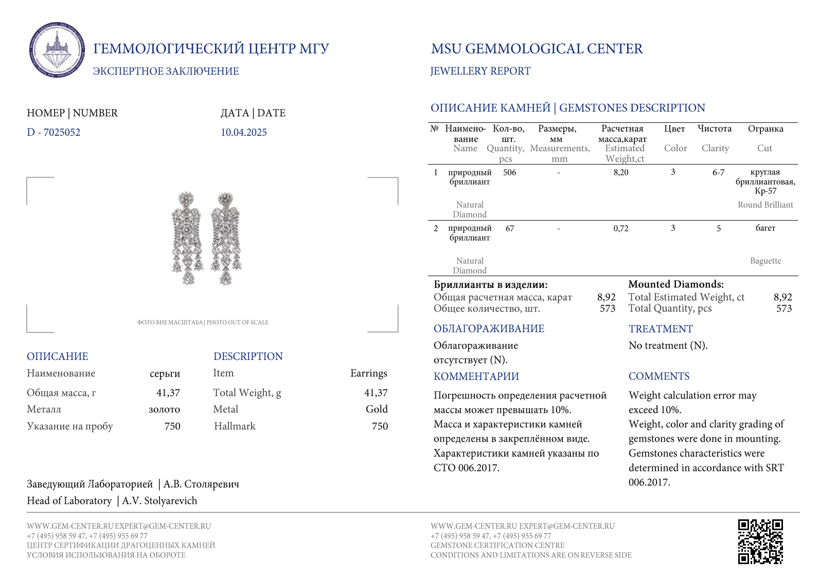Бриллианты: - 506 шт. Кр-57 8,20 ct. (3/6-7) - 67 шт. огранки "багет" 0,72 ct. (3/5)
