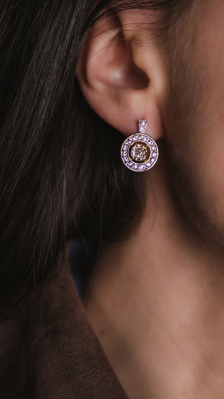 Бриллианты: - 1 шт. 0,67 ct. (Fancy Light Brown / VS1) - 1 шт. 0,63 ct. (Fancy Light Brown / SI2), пурпурные сапфиры 36 шт. 0,88 ct. (Pinkish Purple / Type II)