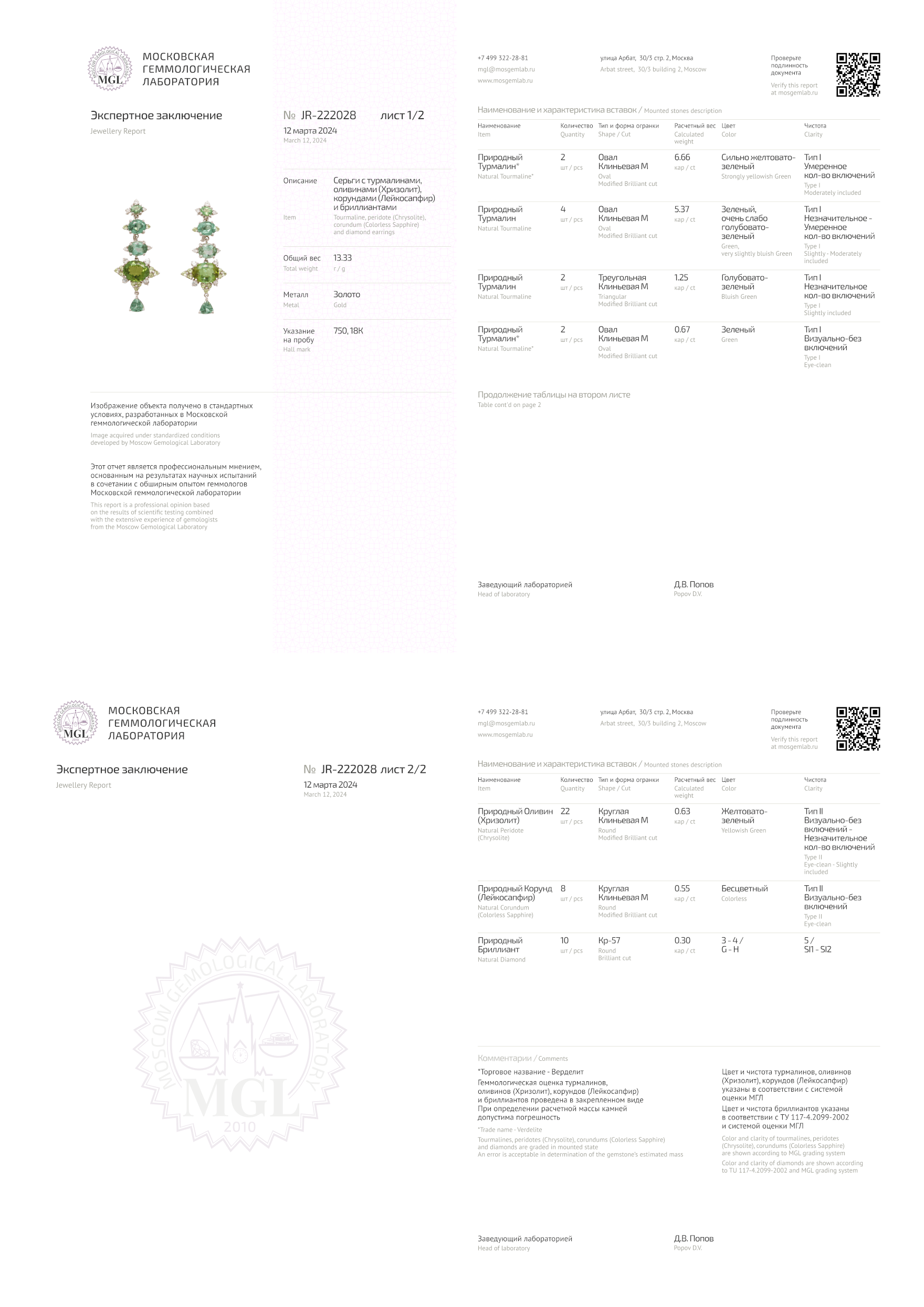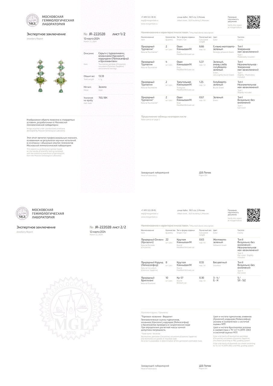 Турмалины 10 шт. 13,95 ct., Хризолиты 22 шт. 0,63 ct., Лейкосапфиры 8 шт. 0,55 ct., Бриллианты 10 шт. 0,31 ct. (3-4/5)